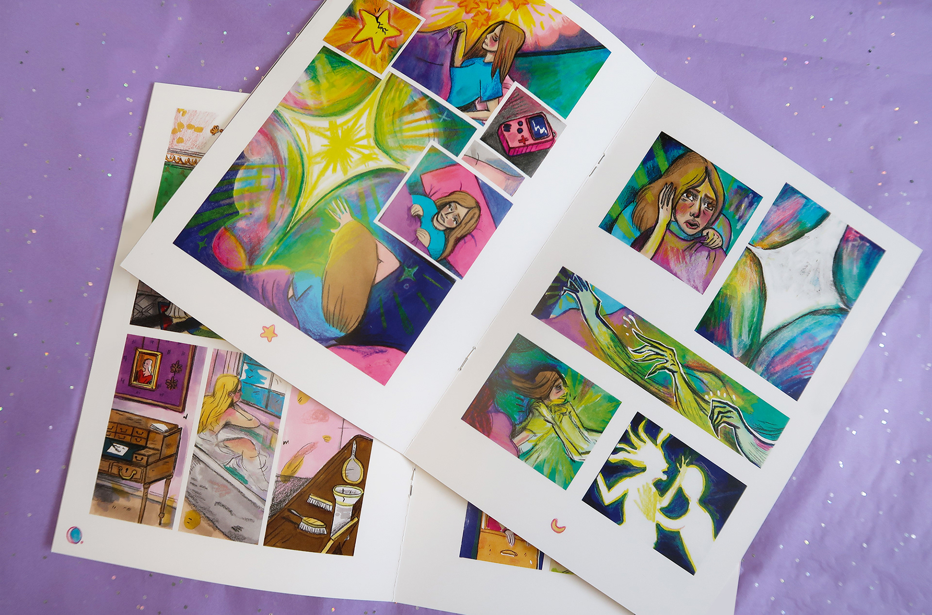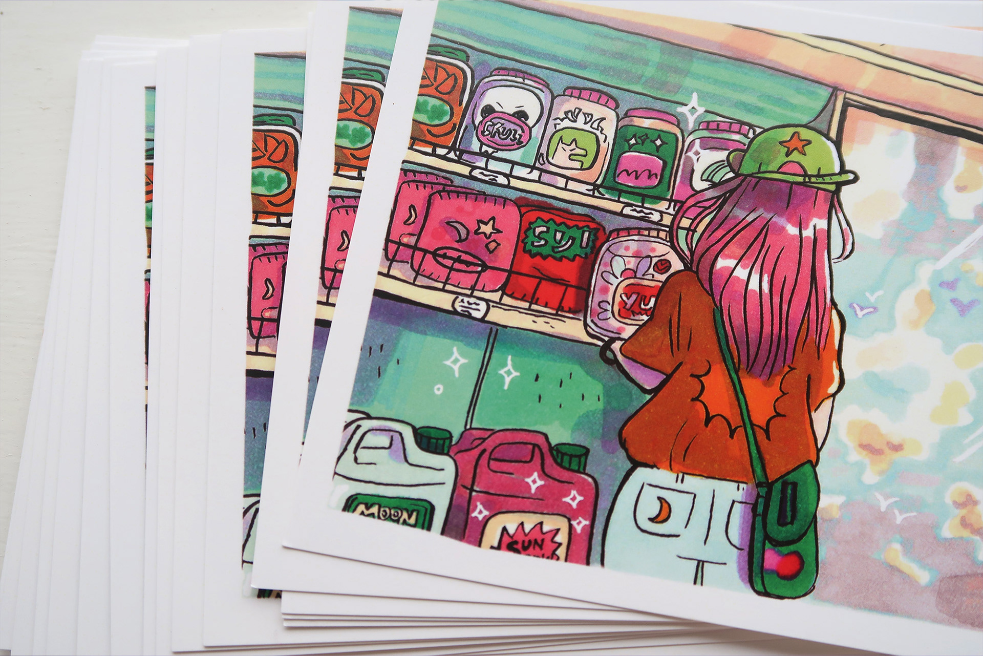 For my small business I create comics, stickers and art prints. I have sold them in the past on etsy/kickstarter/patreon and received many orders. I love bright happy colours, cats and horror comics! Most of these works are hand drawn then printed but some are digital. I love painting and using pencils though!